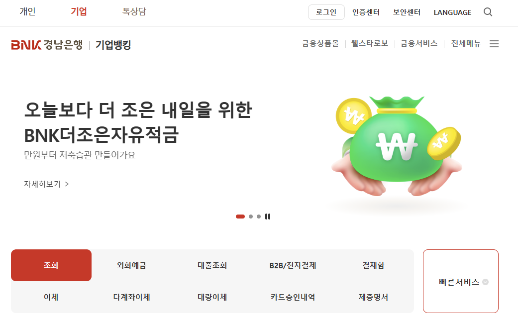 경남은행의 기업인터넷뱅킹은 기업 고객에게 많은 편리함을 제공합니다.