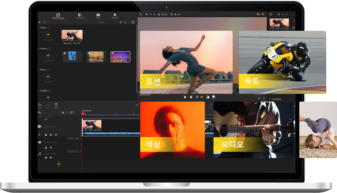기본적인 편집 기능 외에도, 다양한 효과와 전환 효과를 제공하여 퀄리티 높은 영상을 제작할 수 있습니다.