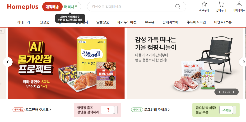 홈플러스는 다양한 식료품, 가전제품, 생활용품 등을 한곳에서 구매할 수 있는 온라인 쇼핑몰입니다.