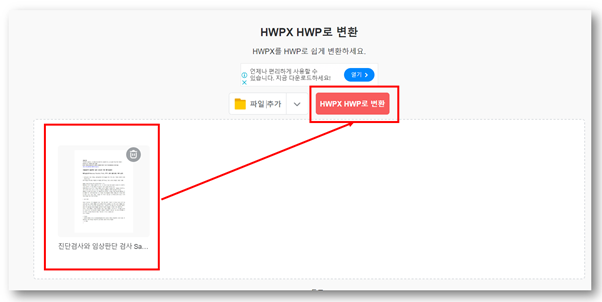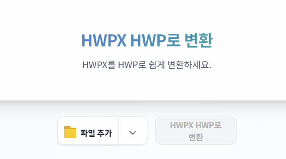 - 파일 업로드 : 변환 도구에 접속한 후, '파일 추가' 버튼을 클릭하여 변환하고자 하는 HWPX 파일을 선택합니다.