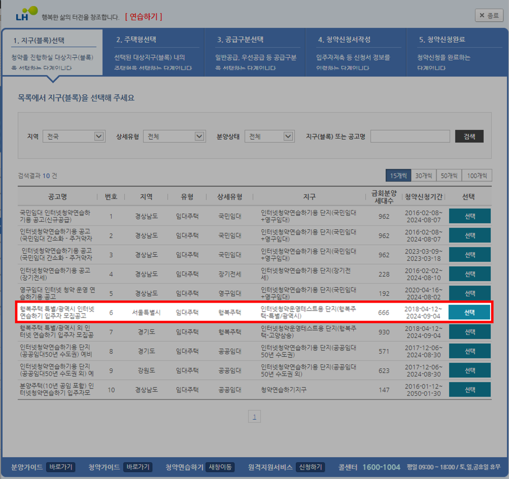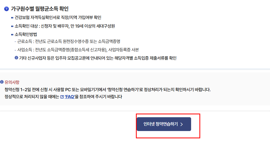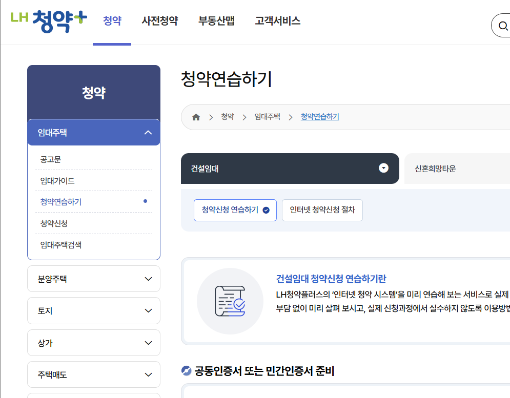 - 청약 연습하기 : 실제 청약 신청과 동일한 절차를 미리 연습해 볼 수 있는 기능입니다.