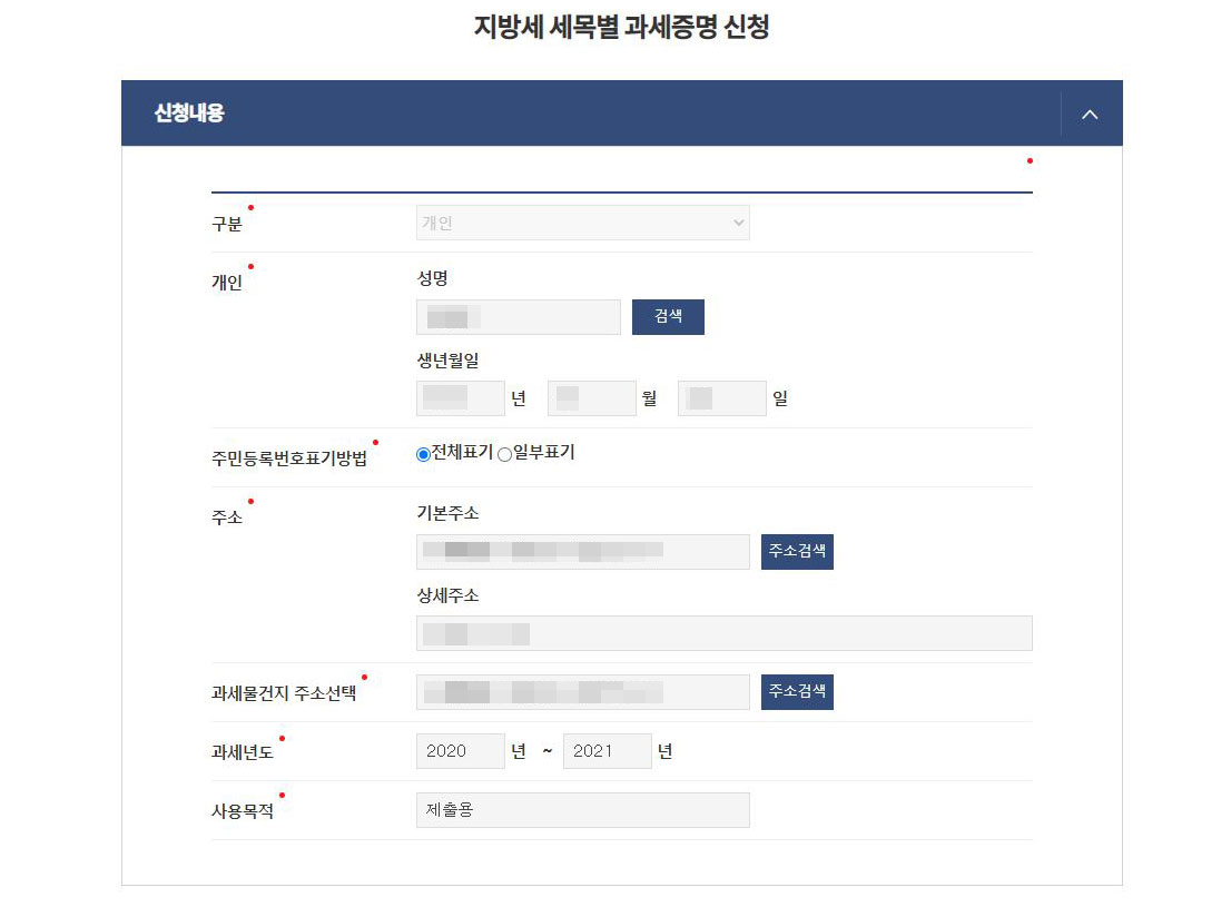 로그인 후, 지방세 납세증명서 발급 신청서를 작성합니다. 필요한 정보를 정확히 입력해야 하며, 특히 주소와 주민등록번호는 정확히 기입해야 합니다. - 발급 요청하기