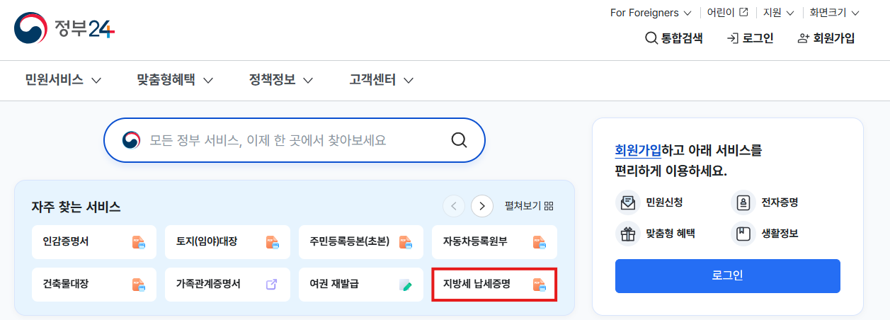 먼저, 정부24 홈페이지에 접속합니다. 메인 화면에서 '지방세 납세증명서' 옵션을 찾아 클릭합니다. - 로그인하기