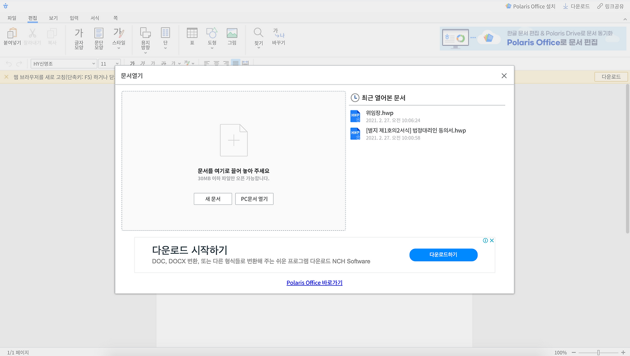- 문서 선택 : 열고자 하는 한글 파일(.hwp)을 선택하고 '열기' 버튼을 클릭합니다.