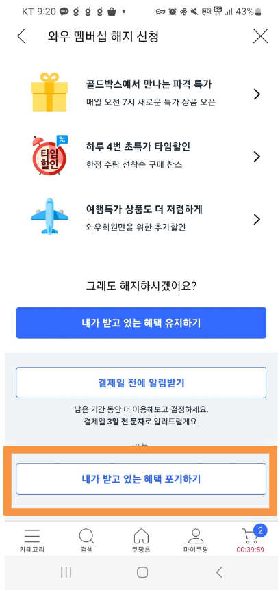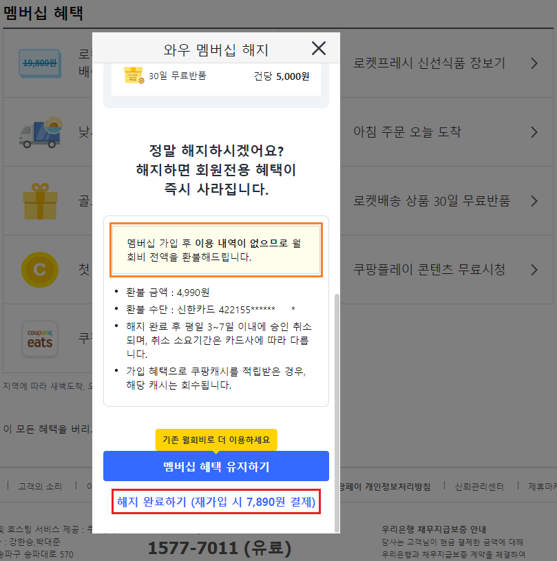 이렇게 간단한 절차로 쿠팡 와우회원 탈퇴가 가능합니다.