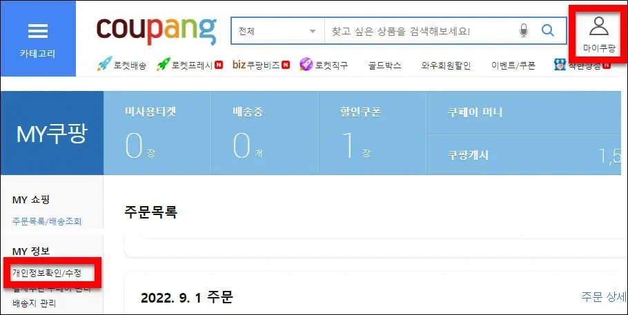 - 마이쿠팡 클릭 : 하단 메뉴에서 '마이쿠팡' 아이콘을 클릭합니다.
