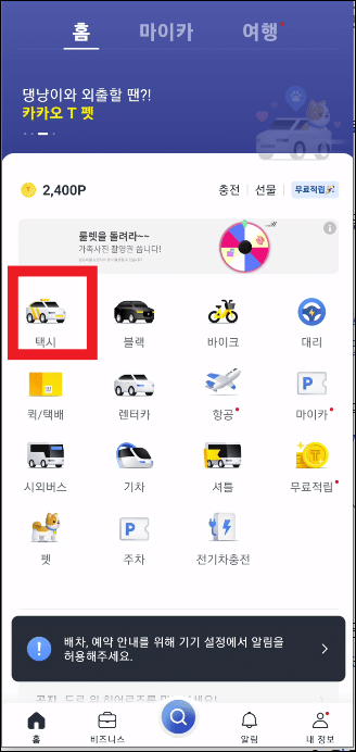 이제 본격적으로 택시를 예약해보겠습니다. 앱의 홈 화면에서 "택시 예약" 버튼을 클릭합니다.