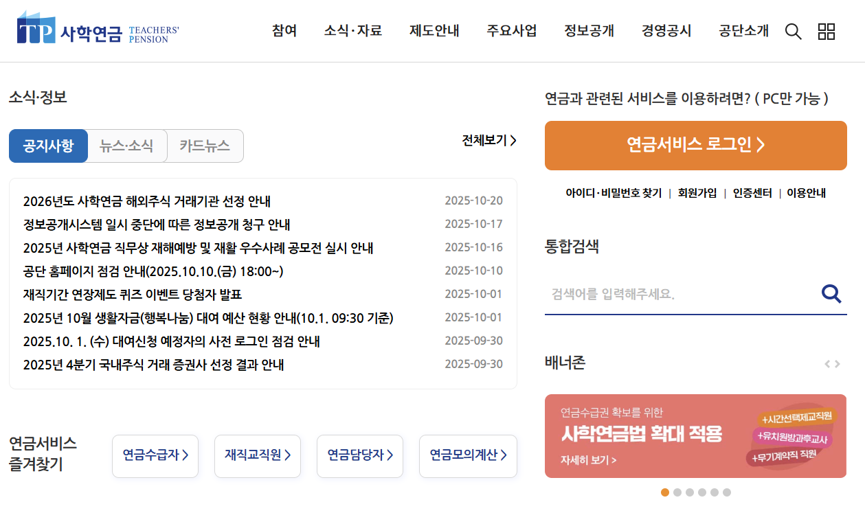 메인 페이지에서는 사학연금관리공단의 주요 서비스와 최신 소식이 눈에 띄게 배치되어 있습니다.