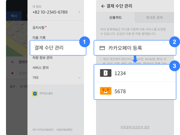 - 카드 결제 : 미리 등록한 신용카드로 결제할 수 있습니다. 결제 방법은 앱 내 '결제 설정'에서 카드 정보를 입력하면 됩니다.