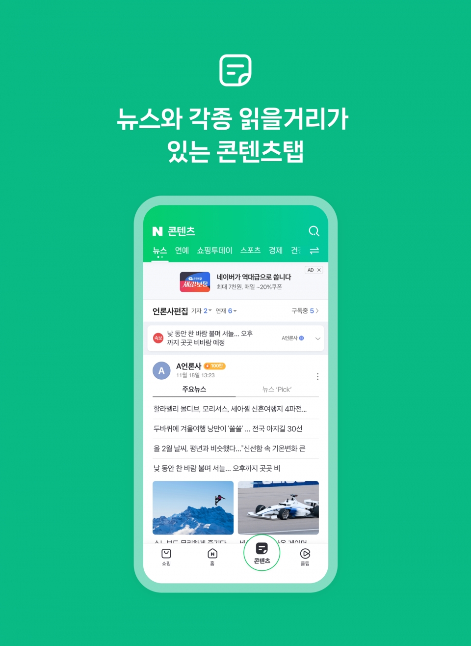 네이버 앱을 통해 뉴스, 블로그, 카페, 쇼핑 등 다양한 콘텐츠를 손쉽게 이용할 수 있습니다.