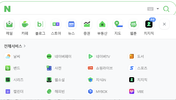 - 검색창에 '네이버' 입력 : 상단의 검색창에 '네이버'라고 입력하고 검색 버튼을 누릅니다.