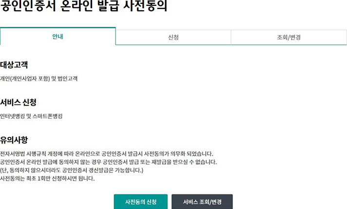 - 인증서 발급 : 공인인증서를 발급받거나 타행 인증서를 등록합니다.