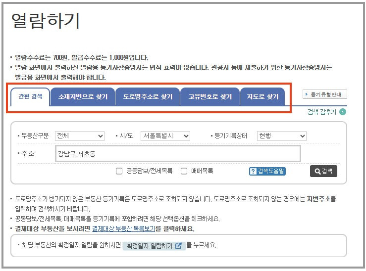 - 조회 메뉴 선택 : 메인 화면에서 '등기조회' 메뉴를 선택합니다.