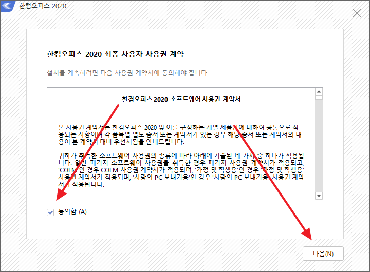 - 사용자 동의 : 라이센스 동의 화면이 나타나면, 내용을 읽고 동의합니다.