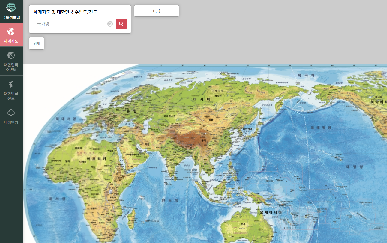 네이버에서 제공하는 지도 서비스도 유용한 방법입니다. 검색창에 "세계지도"라고 입력하면, 국토정보플랫폼으로 연결되며,