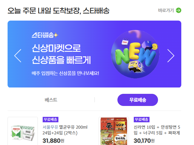 그 중에서도 '스타배송' 서비스는 3만원 이상 구매 시 무료로 제공되며, 당일 배송이 가능합니다.