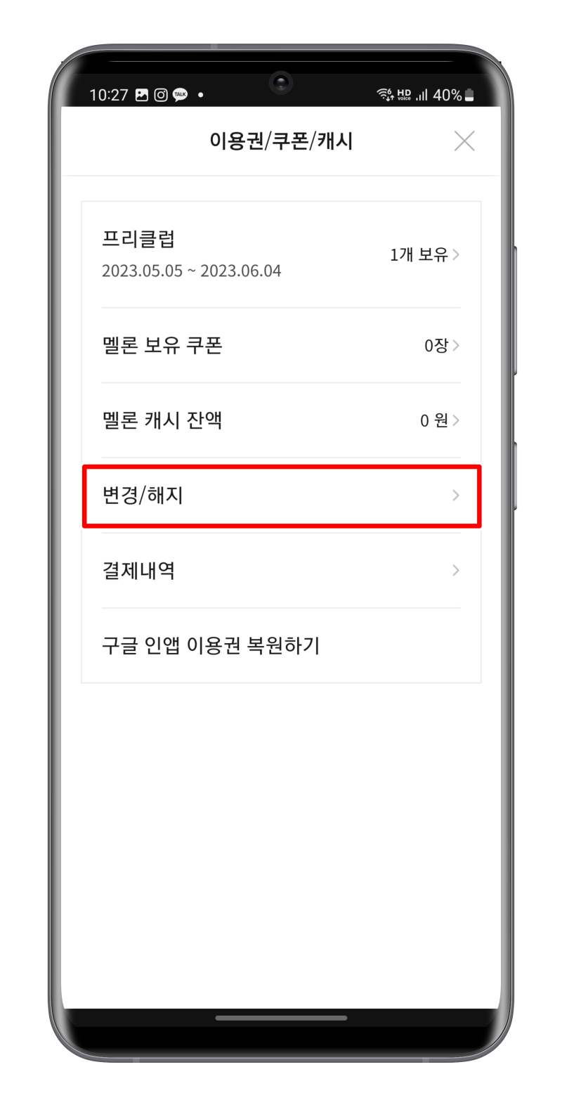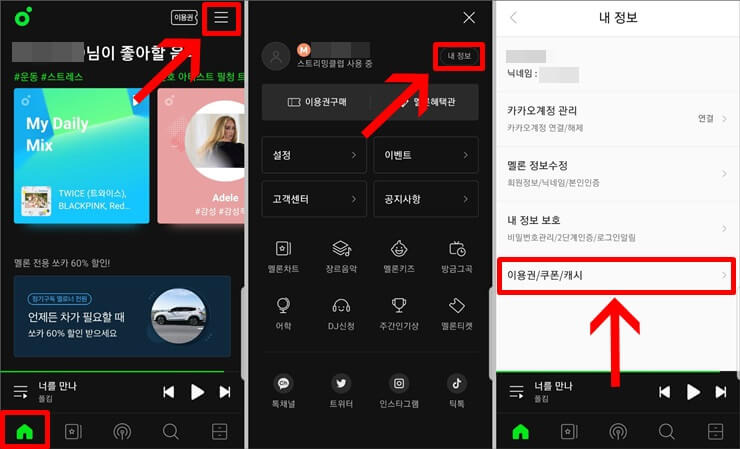 - '이용권/쿠폰/캐시'를 클릭합니다.