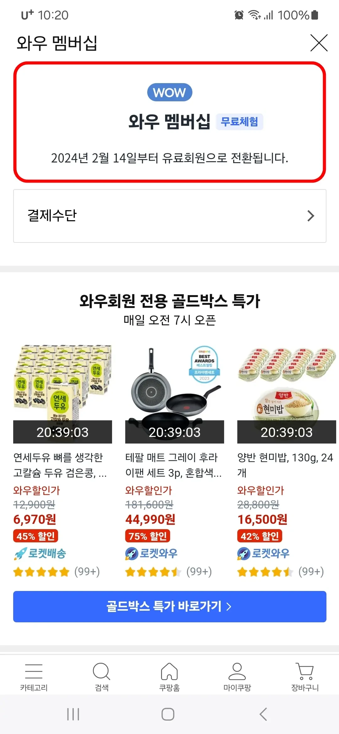 - A: 쿠팡 앱 내 '회원가입' 메뉴를 통해 로켓와우 회원으로 가입할 수 있습니다.