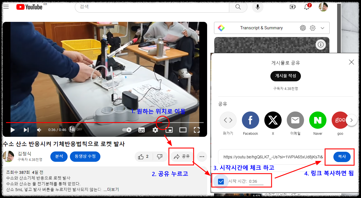 유튜브에서는 특정 구간부터 시작하는 링크를 만들 수 있습니다.