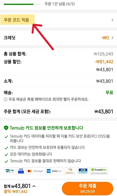 테무에서는 다양한 결제 방법을 지원합니다. 신용카드, 체크카드, 모바일 결제 등 여러 가지 방법으로 간편하게 결제할 수 있습니다.
