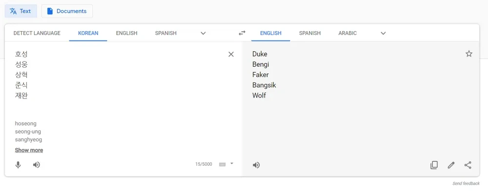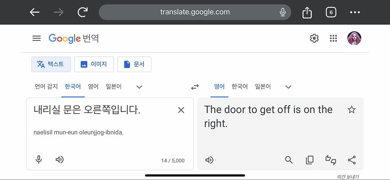 화면에 나타나는 입력창에 번역할 텍스트를 입력하면, 오른쪽에 번역 결과가 실시간으로 표시됩니다.