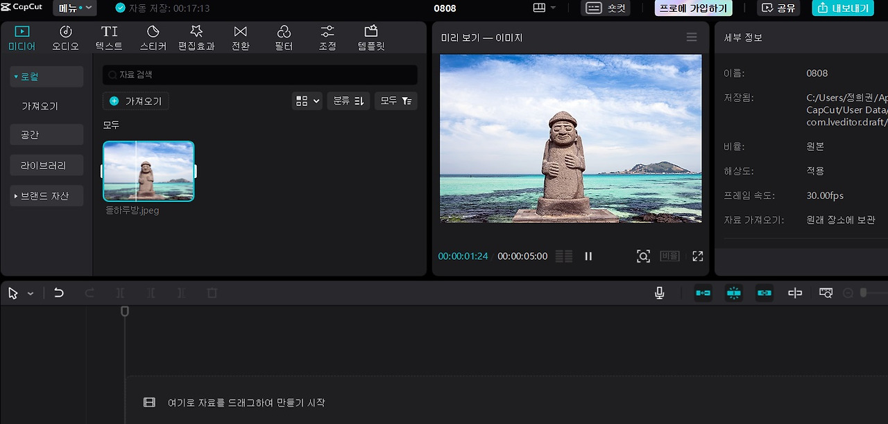 - 편집 시작 : 불러온 동영상을 타임라인에 끌어다 놓고, 다양한 효과와 필터를 추가하여 편집을 진행합니다.