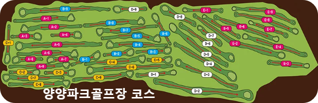 양양 파크골프장은 총 45홀로 구성되어 있으며, 각 홀은 다양한 난이도를 가지고 있습니다.