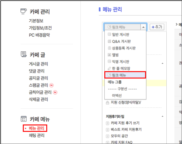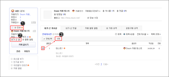 - 화면 왼쪽 메뉴에서 '내 카페'를 클릭합니다.