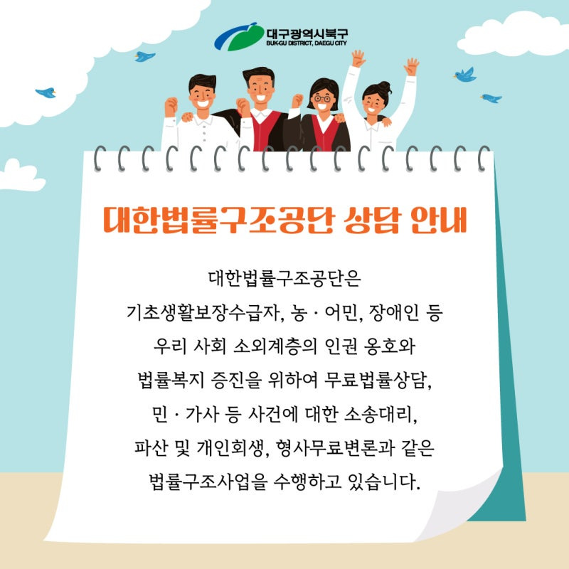 대한법률구조공단은 법률적 도움이 필요한 국민들에게 무료로 법률 상담과 지원을 제공하는 기관입니다.