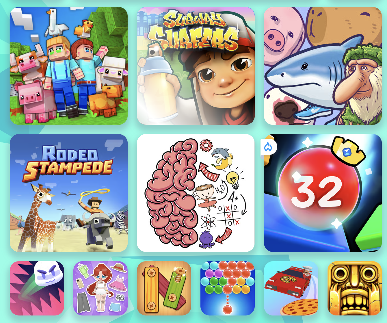 - 서브웨이 서퍼스 : 빠른 속도의 러닝 게임으로, 장애물을 피하며 최대한 멀리 달리는 것이 목표입니다.