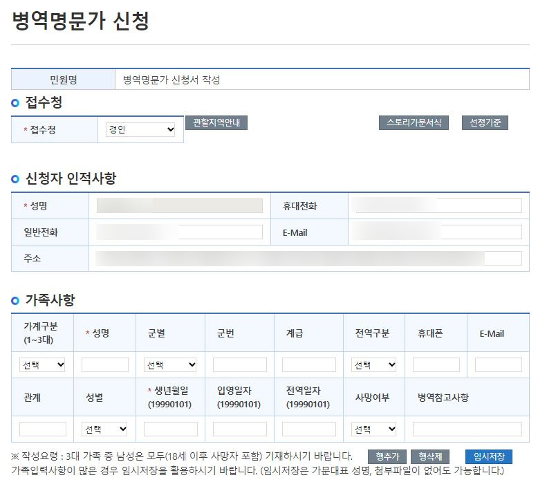 신청서에는 가족 구성원과 각자의 군 복무 이력을 기재해야 하며, 필요한 서류를 첨부해야 합니다.