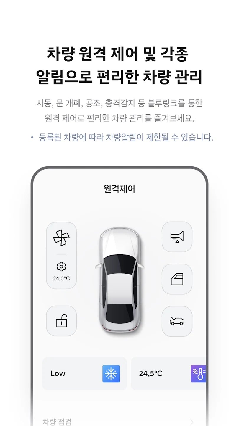 이 앱은 차량의 상태를 실시간으로 확인하고, 정비 이력을 관리하며, 차량의 다양한 기능을 원격으로 제어할 수 있는 기능을 제공합니다.