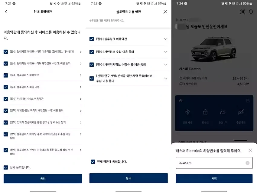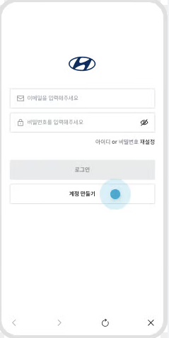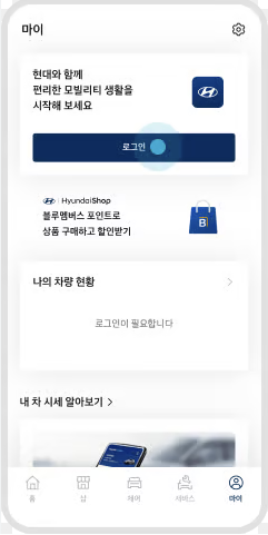 앱을 처음 실행하면 로그인 창이 나옵니다. 현대자동차 계정으로 로그인한 후, 차량 등록을 위한 절차를 따라야 합니다.