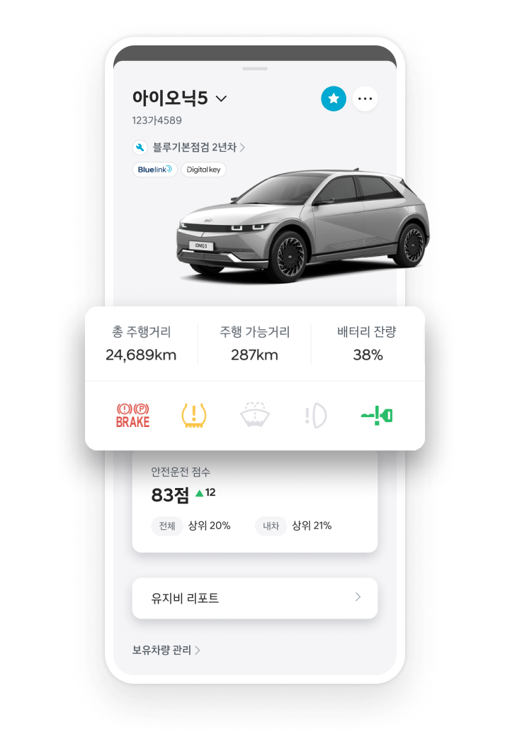 차량의 현재 상태, 주행 거리, 연료 잔량 등을 실시간으로 확인할 수 있습니다. 또한, 차량의 정비 이력을 간편하게 관리할 수 있습니다.