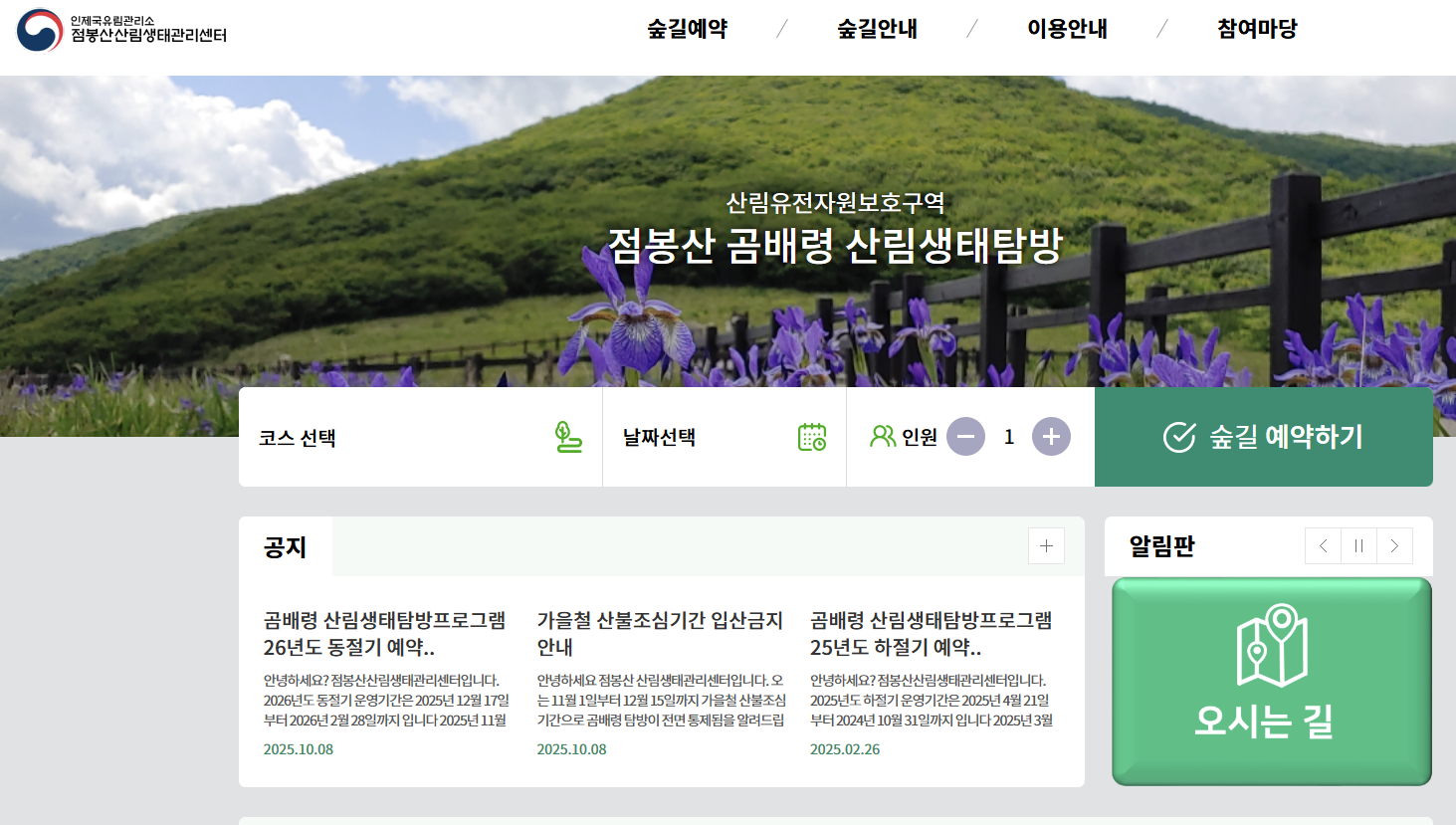 - 탐방로 선택하기 : 곰배령 탐방로를 선택하고, 원하는 날짜와 인원을 입력합니다.