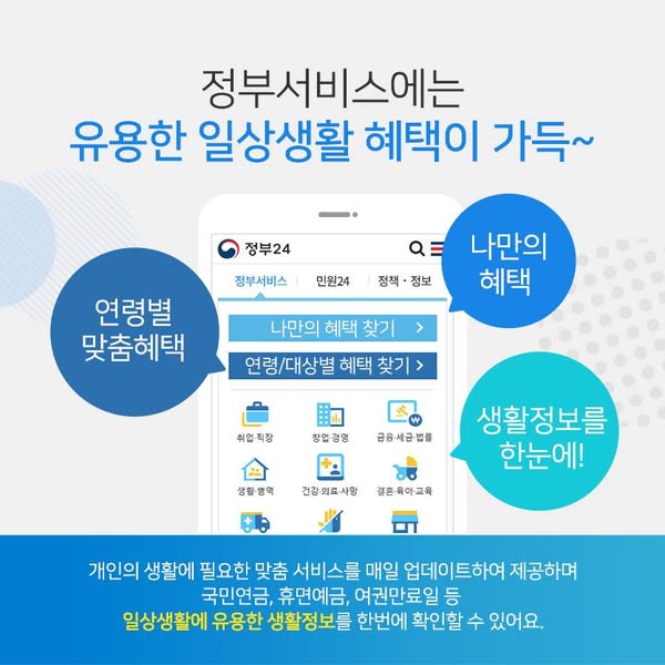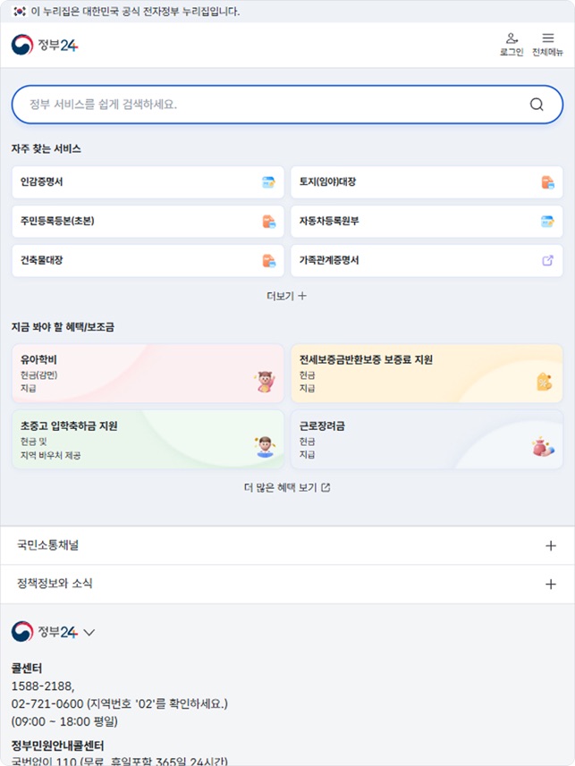 - 민원 신청, 정책 정보, 보조금 정보, 생활 정보 등 다양한 서비스를 제공합니다.