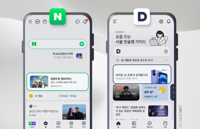 네이버는 검색 서비스와 블로그, 카페 등 다양한 서비스를 제공하지만, 다음은 뉴스와 커뮤니티 중심의 서비스에 더 중점을 두고 있습니다.