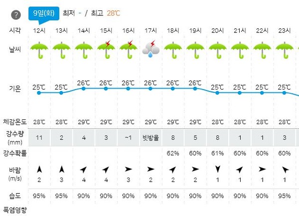 그러면 해당 지역의 날씨 정보가 나타납니다. 또한, 왼쪽 메뉴에서 '동네예보'를 선택하면, 시간별 예보와 함께 다양한 기상 요소를 확인할 수 있습니다.