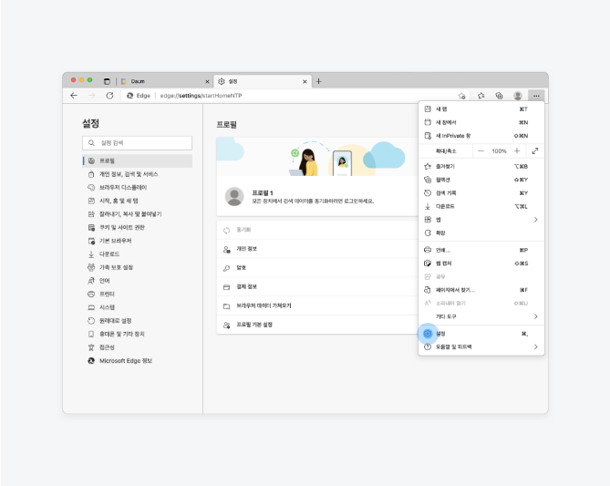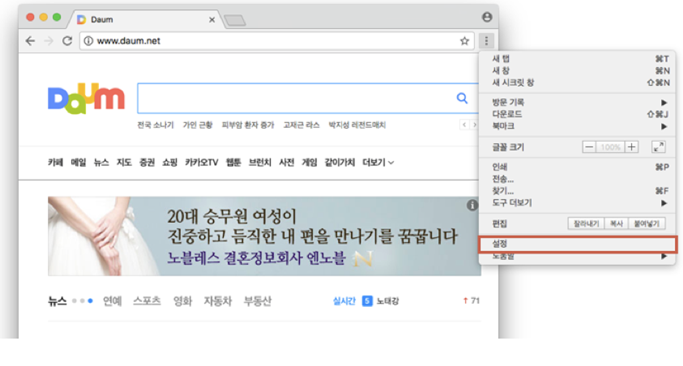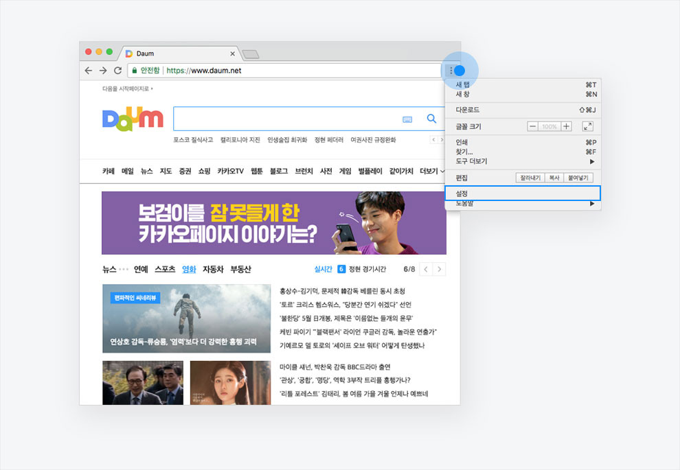 - 브라우저 우측 상단에 있는 점 세 개 아이콘을 클릭한 후, '설정'을 선택합니다.