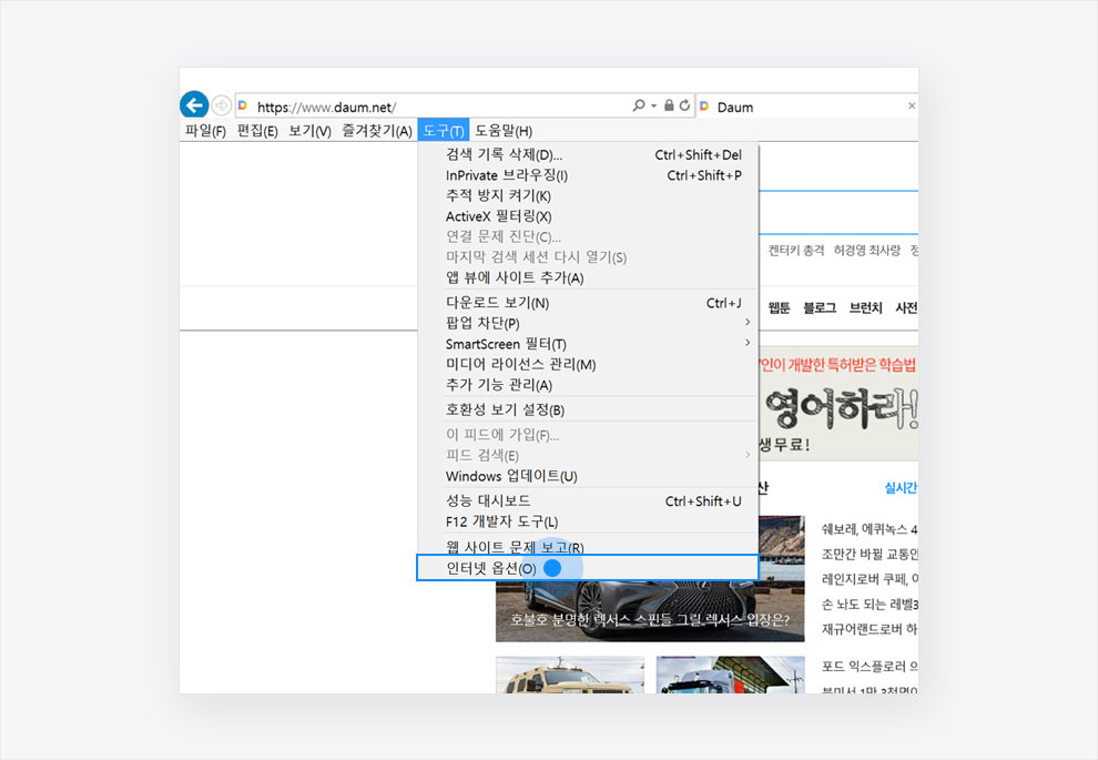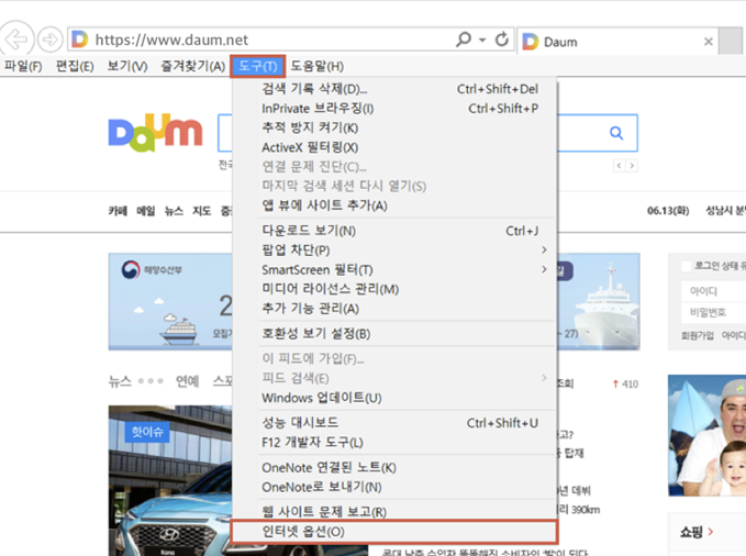- 도구 메뉴에서 인터넷 옵션을 클릭합니다.