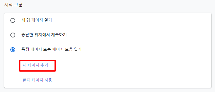 - '특정 페이지 또는 페이지 모음 열기'를 선택한 후, '새 페이지 추가'를 클릭합니다.