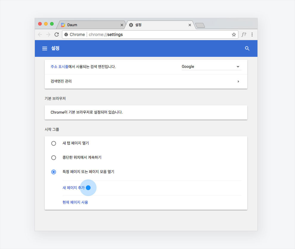이제 크롬을 열면 다음이 시작페이지로 설정되어 있습니다.