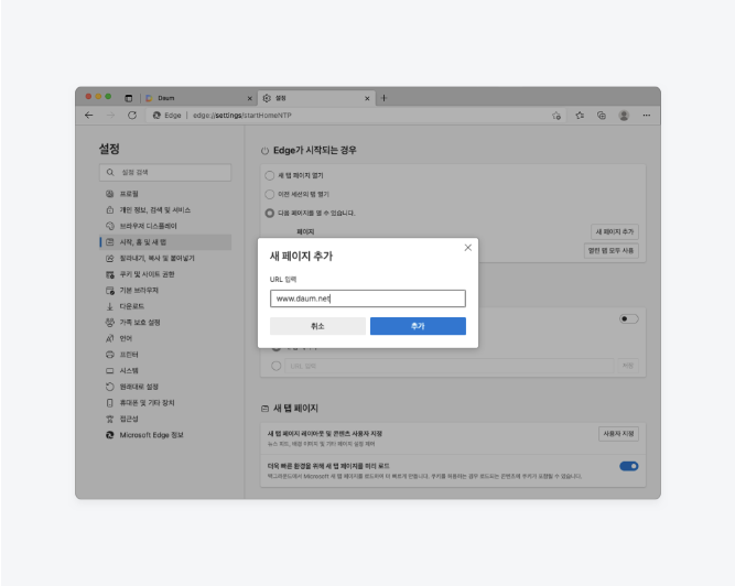 - 왼쪽 메뉴에서 '시작, 홈 및 새 탭'을 클릭합니다.