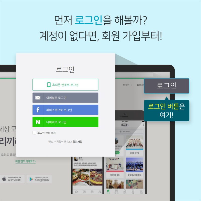웹 브라우저를 열고 네이버 밴드 공식 홈페이지로 이동합니다. - 로그인하기